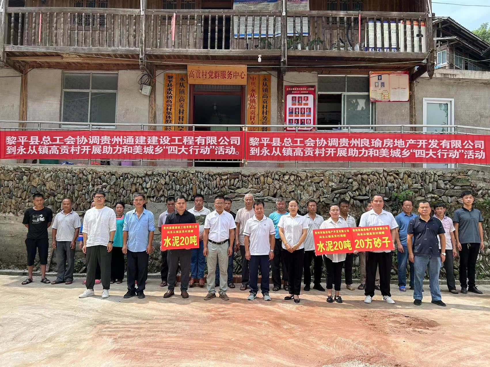 自和美城乡“四大行动”工作开展以来,贵州通建公司积极响应,全力支持。就今年7月底,黎平县总工会协调贵州通建建设工程有限公司到永从镇高贡村开展助力和美城乡“四大行动”活动,活动中贵州通建建设工程有限公司向高贡村捐赠20吨水泥,用于该村的基础设施建设。